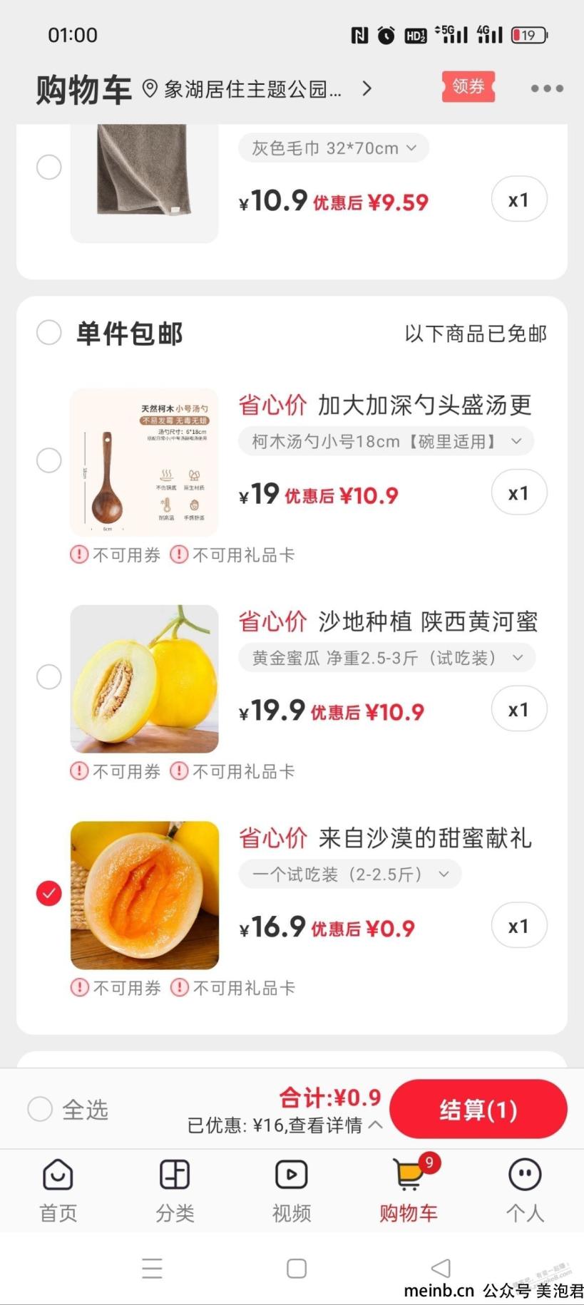 然后搜蜜瓜或者勺,找到10.9的2种蜜瓜或者1个木勺,加入购物车,会发现可以用10红包,而且还是单件包邮。(只需要找单件包邮又满足能使用10元红包的商品就行)