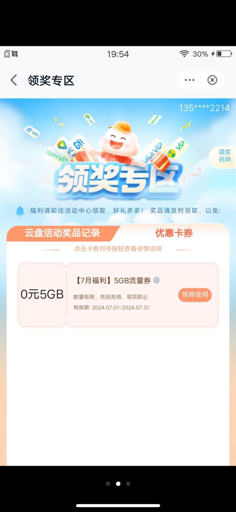 打开中国移动云盘点击我的领奖中心优惠卡券发送验证码即可领注是