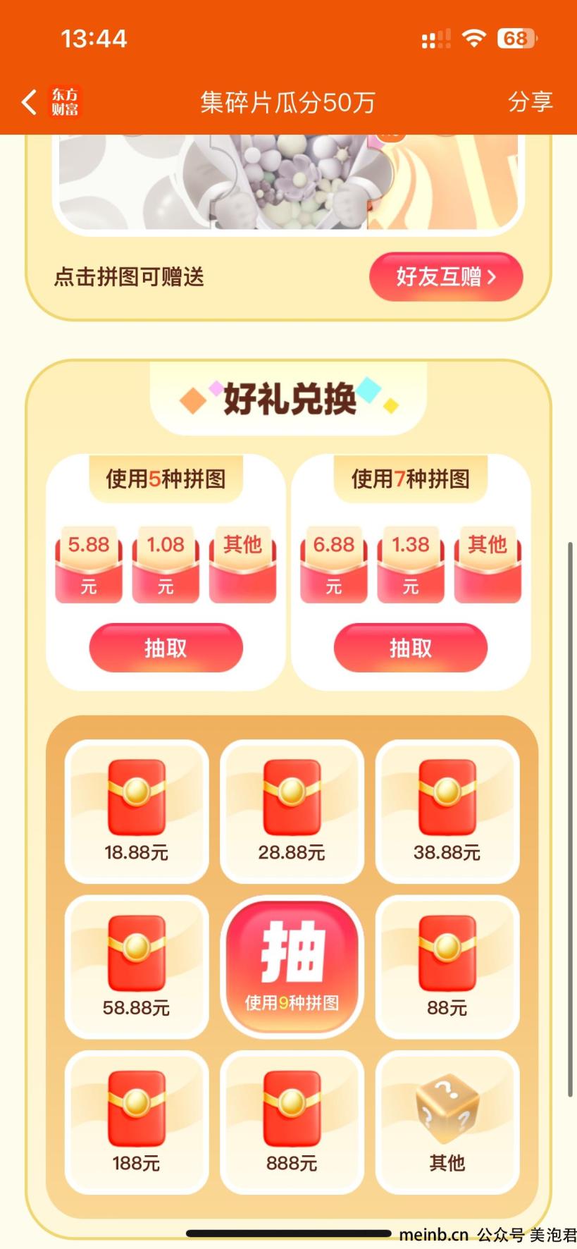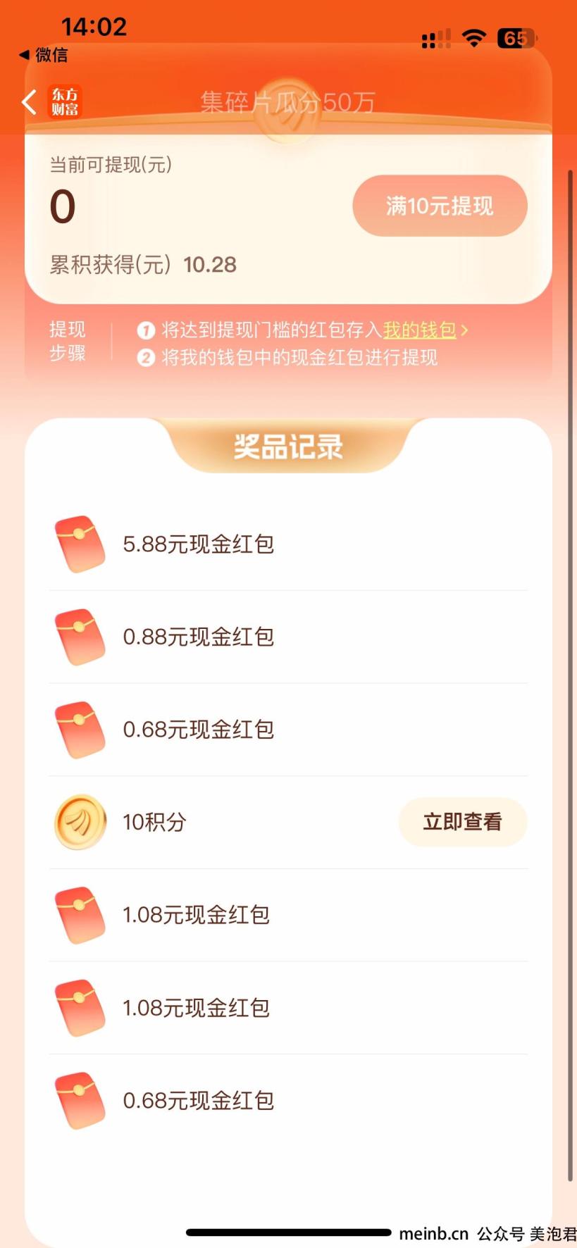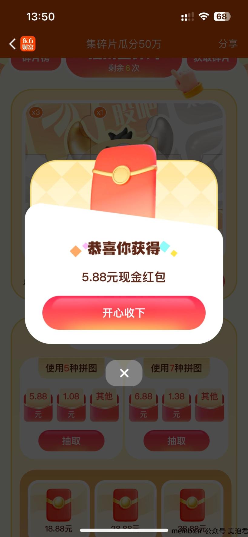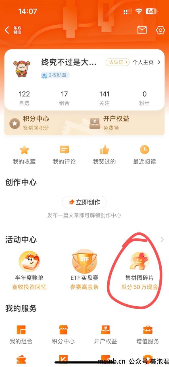 下载东方财富app 我自测老号是0.01,后来用没注册过的号就凑够10了,首页左上角头像进去,集拼图碎片,玩法就是把里面的任务做完抽碎片,满5碎片抽一次,那些开户做不了的那种就不用碰,我是用5种碎片抽的,7跟9的很难凑出来,第一下是0.01的话就换没注册过的号,提现需要开通钱包,老用户之前玩过开过钱包的话,要体现就得给你原来的账号销户掉才行,新人的话就直接能提出来