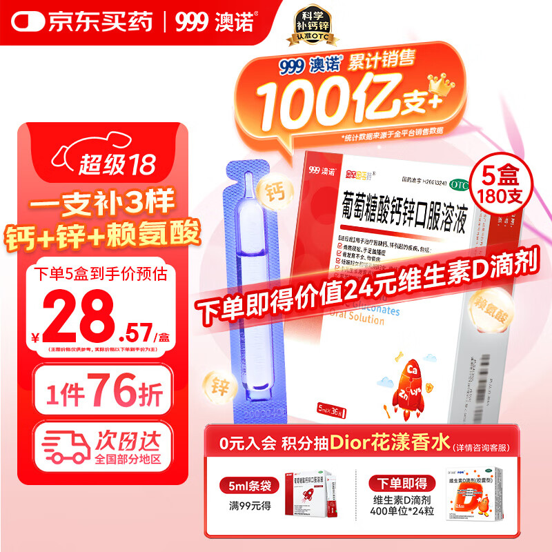 澳诺葡萄糖酸钙锌5ml*180支 浏览加购砸85折券109.8亓 赠达因维