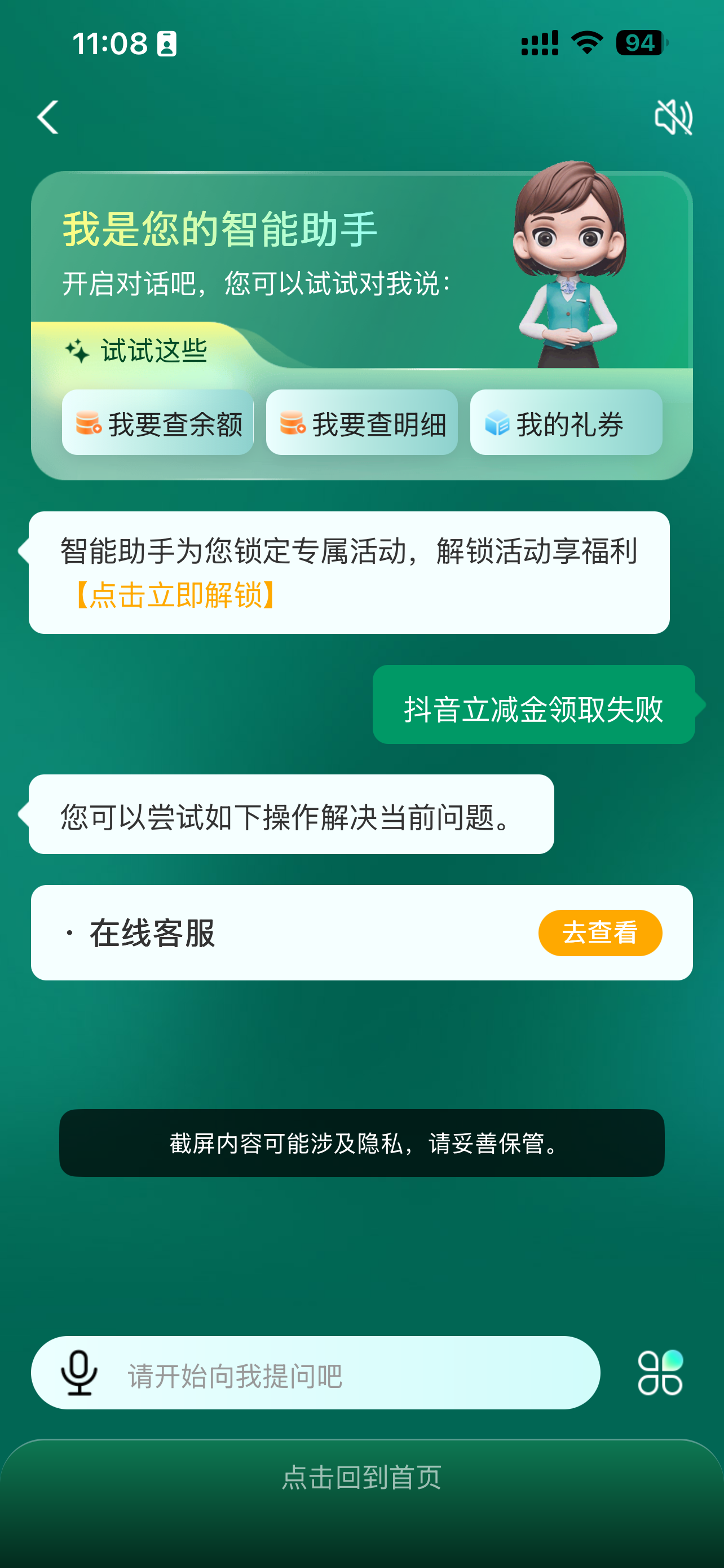 然后找客服输入抖音立减金失败 进到在线客服里面