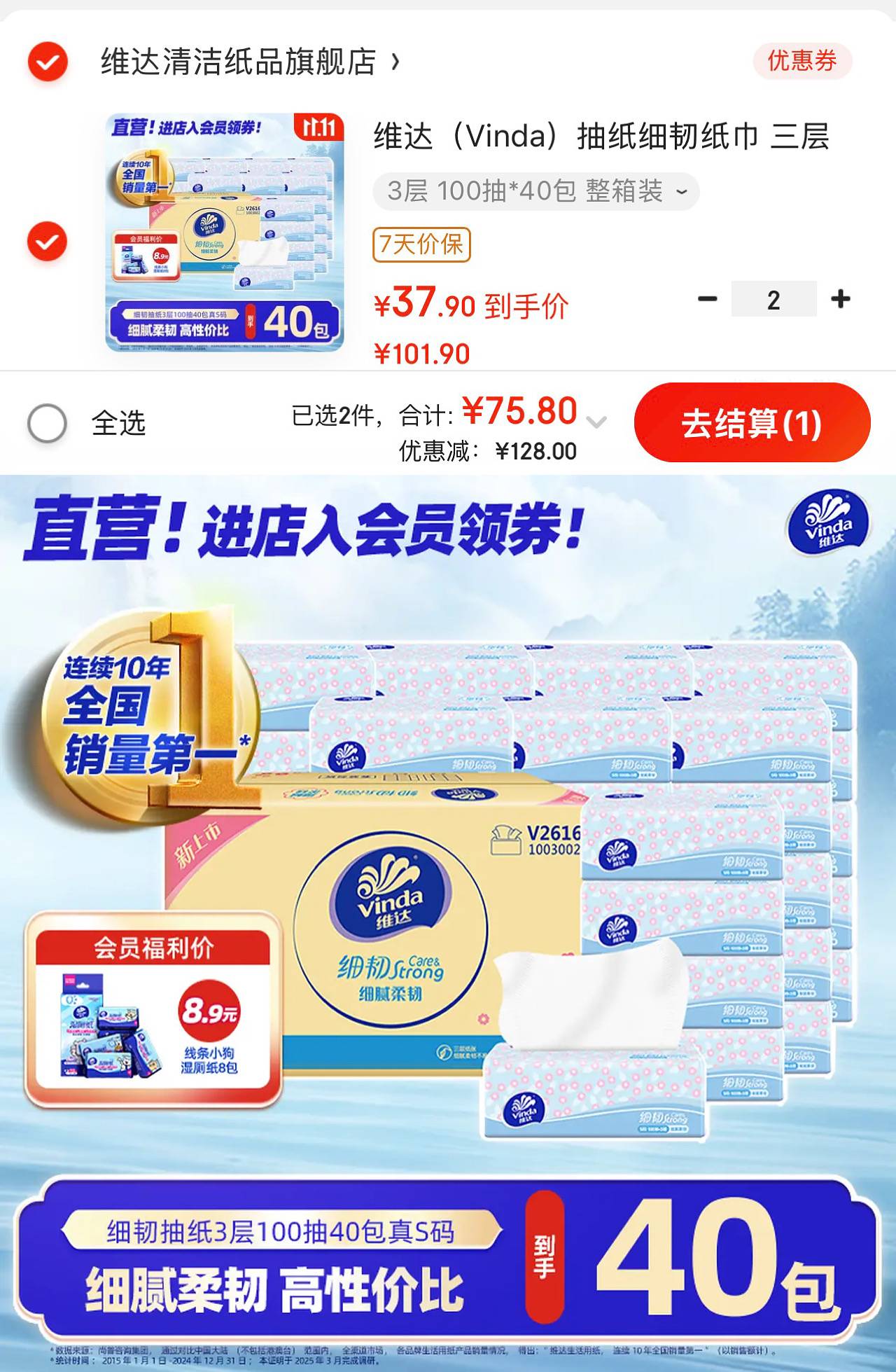 维达抽纸好价先领 30 券https://u.jd.com/Tru9Vt0细韧抽纸100抽40包S码 https://u.jd.com/TruHdwF拍2 件 到手 75.8 折0.94 元/包!