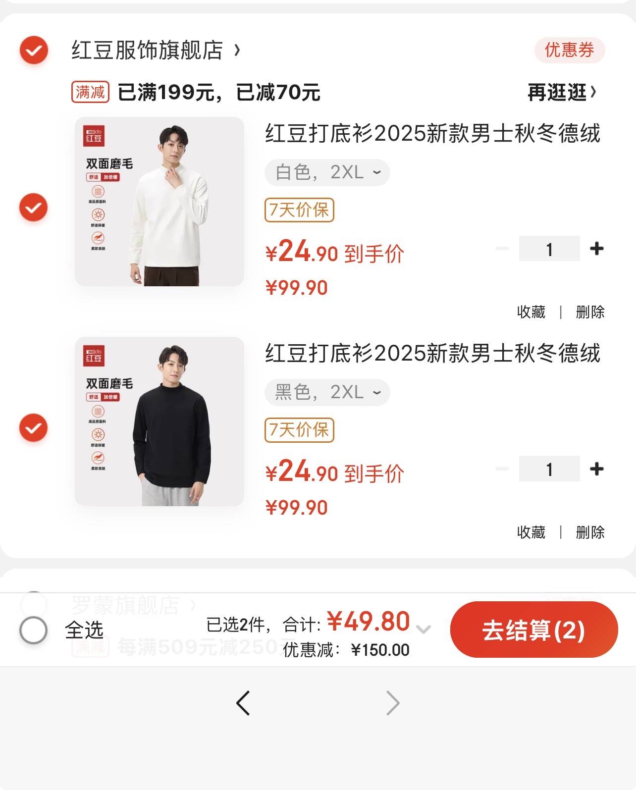快‼️红豆德绒打底长袖T恤好价任选2件 到手49.8元