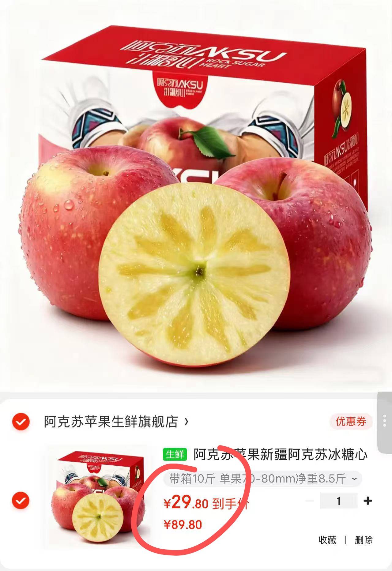 阿克苏新疆冰糖心苹果仅 2.98/斤‼❗好價❗仅 2.98/斤‼❗好價❗带箱10斤装,共符 29.8 员单果70-80mm.超甜多汁