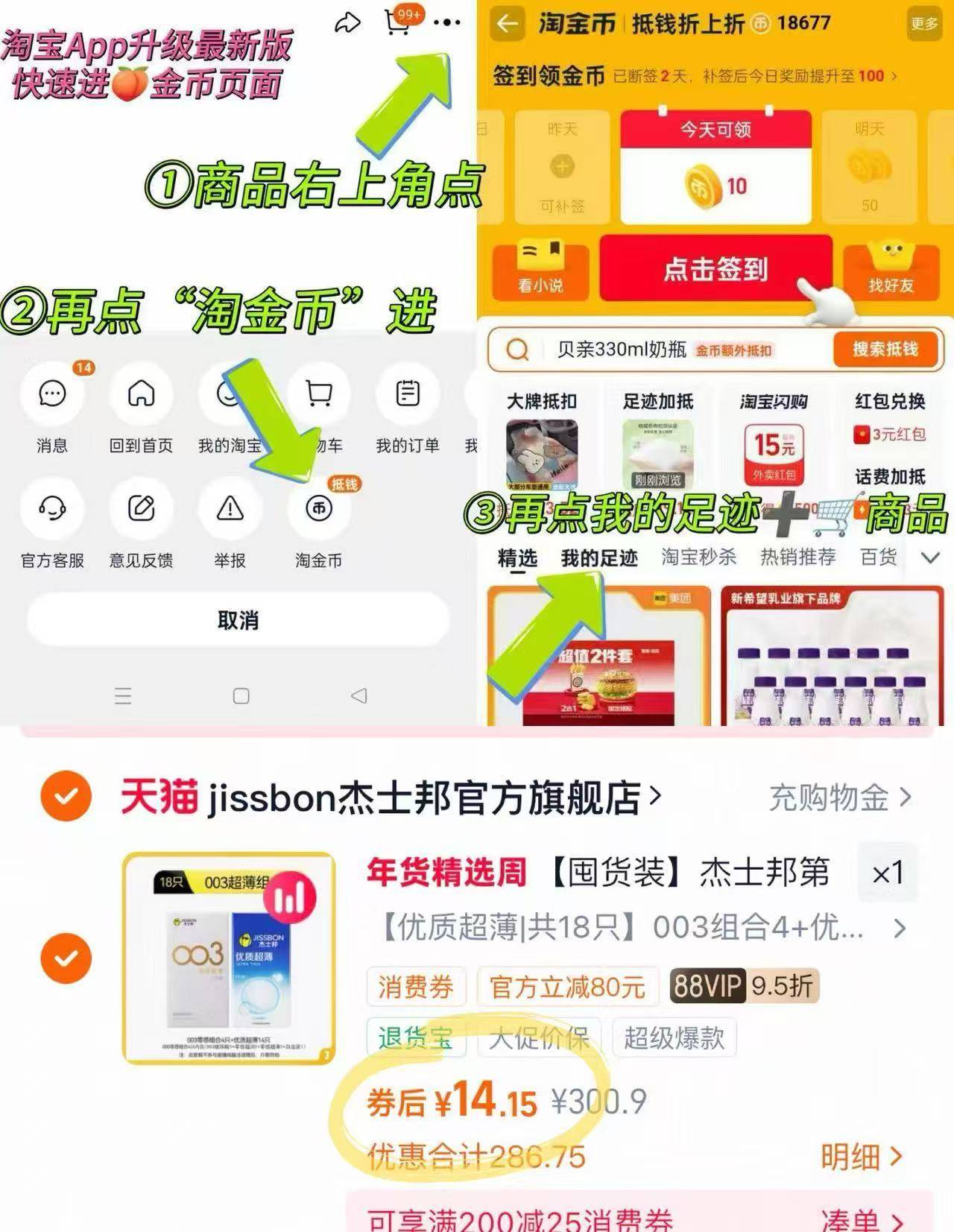 杰士邦超薄小雨伞10/151️⃣领页面206⭕2️⃣右上角[•••]-点"淘金币拍最后一个选项,14.118支,非88贵点