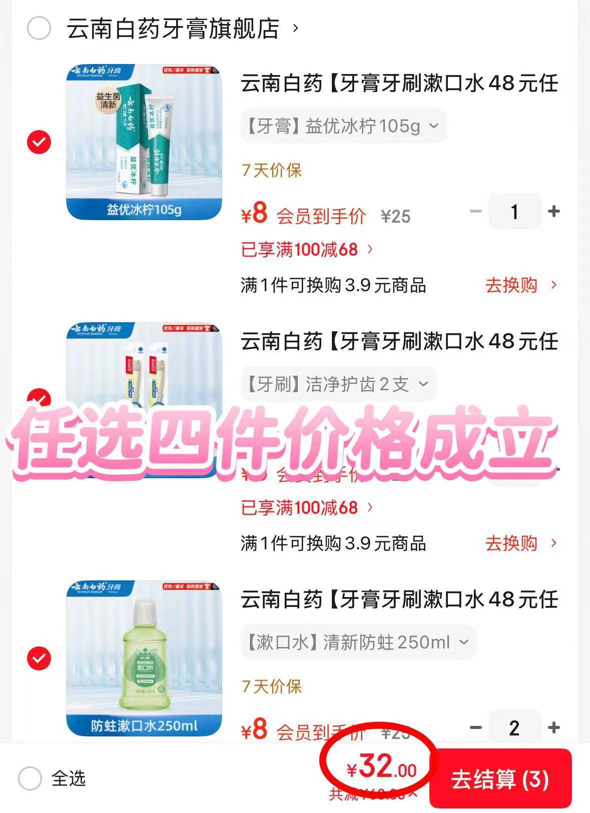 ——云南白药牙膏发車——先领100-68补贴券https://kzurl11.cn/ttYrLw云南白药 牙刷/漱口水/牙膏等https://u.jd.com/NGgmPkJ————任选4件32元;折8元/件*多款可选 这忦划.算 赶紧挑