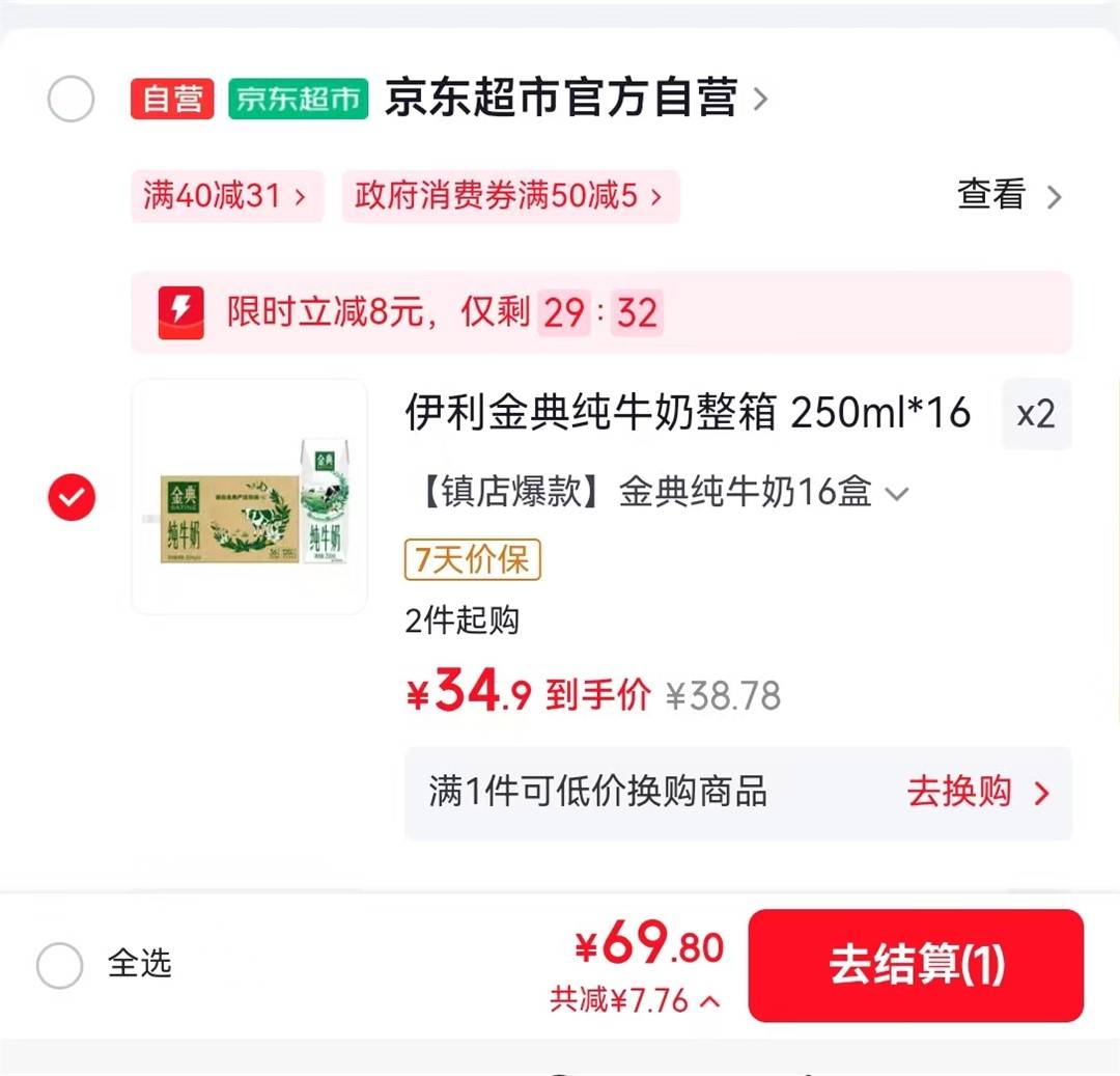 补贴好忦!自营金典拍2! 金典纯奶*16盒