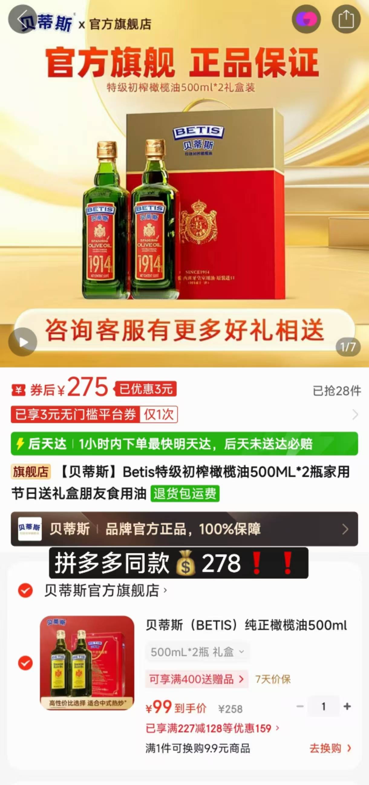 先领227-128大额补贴券https://3.cn/2IiuL-DH贝蒂斯(BETIS)西班牙原装进口 纯正橄榄油500ml*2瓶礼盒装 https://u.jd.com/ca6jtNx券后99元,拼xx同款278