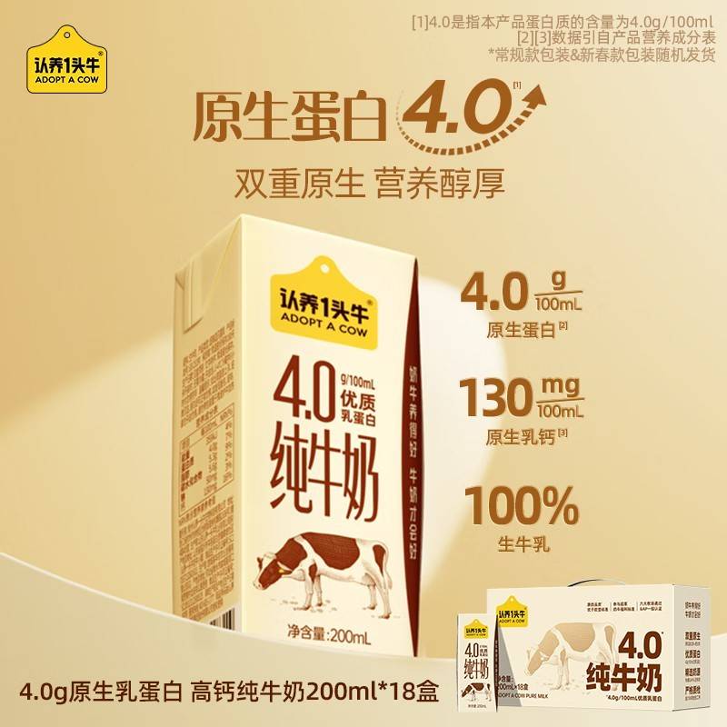 认养一头牛4.0g蛋白纯牛奶200ml*18盒