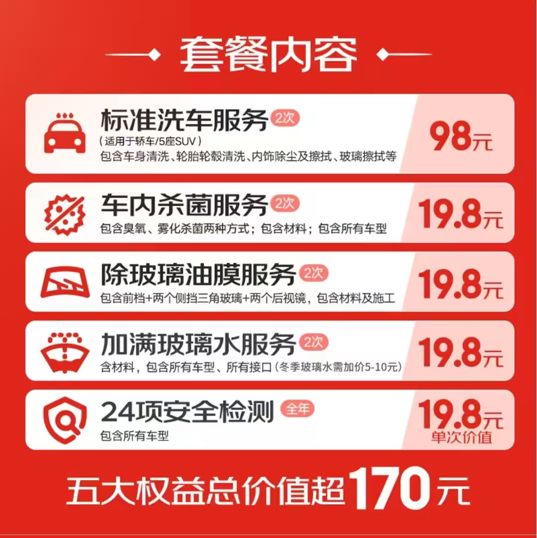 有需安排!京东洗车洗车套餐轿车/SUVhttps://u.jd.com/fG1mE0Q*包含:标准洗车x2*车内杀菌*2+除油膜*2*加玻璃水*2+安全检测——————♦29.9亓!是标准洗车*车身/轮胎/内饰/车玻璃