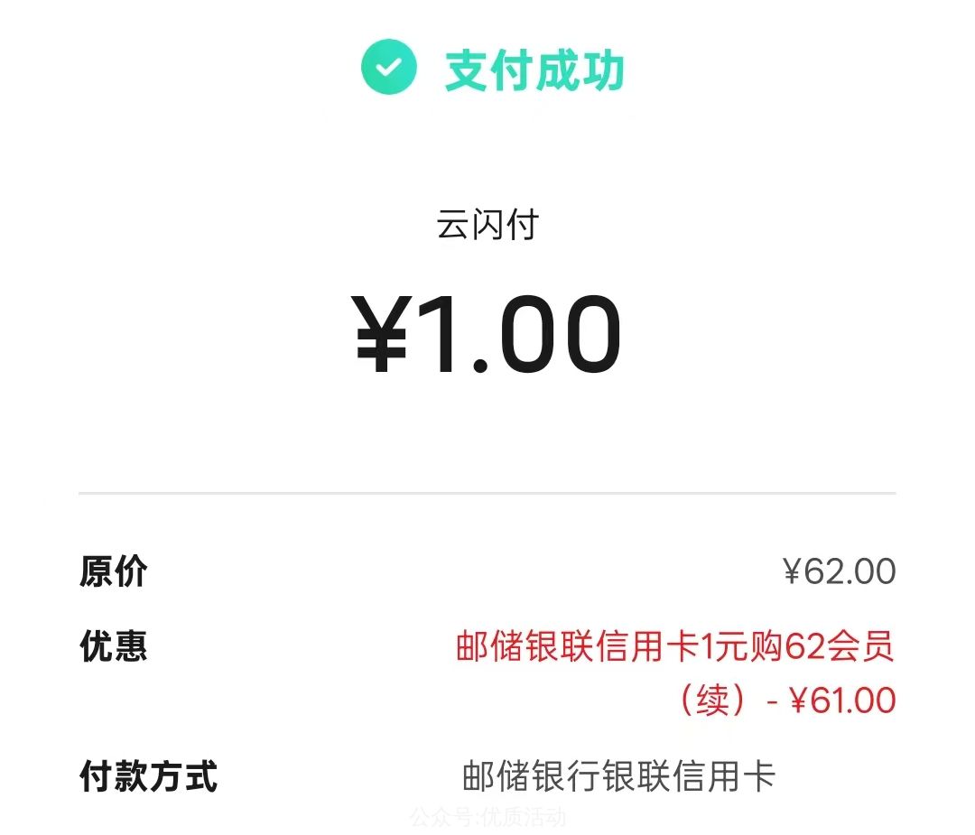江西 有邮储xy卡的 试试看云闪付62会员 1亓买1年